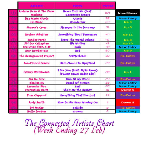 4. Connected Artists wishing to parttake in the chart are asked to please forward (via the radio email) mp3s and cover art or itunes, spotify or youtube links and cover art for whichever song / songs they would like featuring in the chart.
