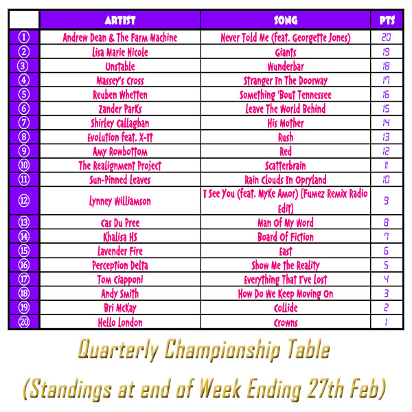 *Please Note:- Chart entries placing in the TOP 20 chart now also earn Quarterly Championship points*